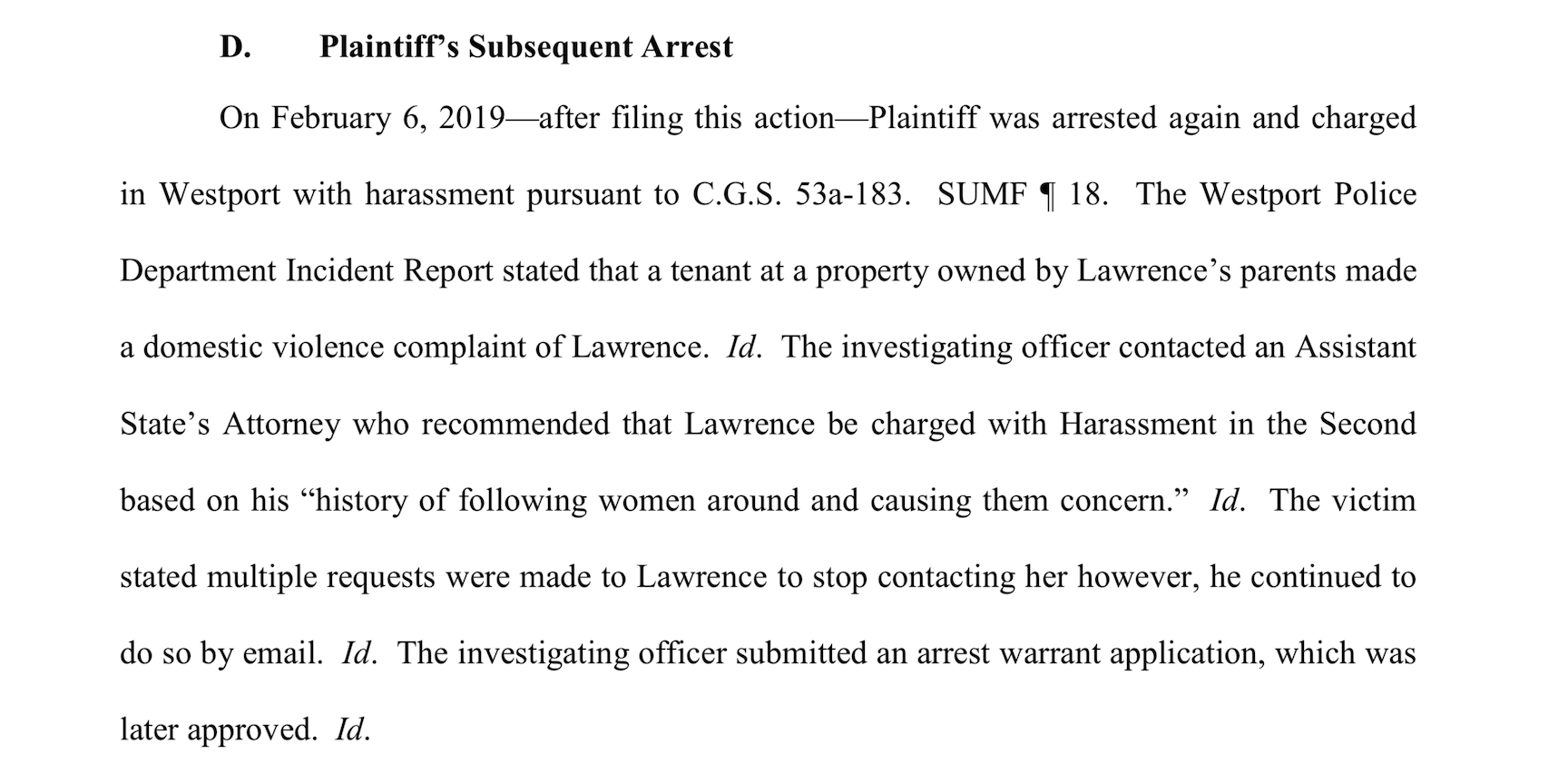It is obvious that Officer Mark Grasso re-submitted this insane April 17, 2019 Arrest Warrant for allegedly “stalking” 61 year old Marie Pelletier that was rejected twice by D.A. Vieux because he knew he had nothing in regards to Email Harassment of Ana Campbell as has been established now with no Email Discovery that shows NO harassment under the rules of LORRAINE V. MERKEL AMERICAN INSURANCE INC. let alone common sense, and this Officer Grasso was hoping to pile on even more utter nonsense (See Lack of Discovery) not only because the Westport Police know from my website www.WestportJamesLawrenceNOTGuilty.com about my case against the police false narrative and the media slander for the First False Arresting Second Degree Breach of Peace ordeal, but also because Officer Grasso knew I was looking to bring his corrupt self to court via a Franks Hearing Request addressing this Second False Arrest “Email Harassment” ordeal to which he