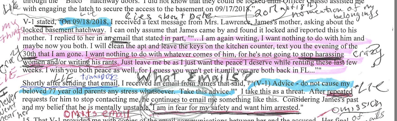 First I will address this omitted piece of Discovery Evidence that was written to exist within the Arrest Warrant. In Section 14 Paragraph 6 of the Arrest Warrant quote: V-1 stated “On 9/18/2018 I received a text message from Mrs. Lawrence, James’ mother, asking about the locked basement hatchway. I can only assume that James came by and found it locked and reported this to his mother. I replied to her in an Email that stated in part ..., “I am again writing, I want nothing to do with him and now maybe you both. I will clean the apartment and leave the keys on the kitchen counter, text you the evening of the 30th that I am gone. I want nothing to do with whatever comes of him, for he’s not going to stop harassing women and/or writing his rants. Just leave me be as I just want the peace I deserve while renting these last few weeks. I wish you both peace as well, for I guess you won’t get it until you are both back in Fl. …”